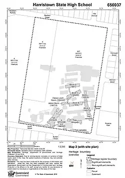 - ^ a b c d e f g h i j k l m n o p q r s t u v w x y z aa ab ac ad ae af ag ah ai aj ak al am an ao ap aq ar as at au av aw ax ay az ba bb bc bd be bf bg bh bi bj bk bl bm bn bo bp bq br bs bt bu bv bw bx by bz ca cb cc cd ce cf cg ch ci cj ck "Harristown State High School (entry 650037)". Queensland Heritage Register. Queensland Heritage Council. Retrieved 14 February 2018.