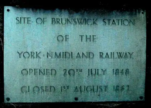 During a snowstorm exacerbated by strong winds in December 1949, mayor Mary Fisher unveiled a plaque on The Stray near the original site of Brunswick station. The plaque commemorates the centenary of the station, and the inscription says: "Site of Brunswick station of the York N. Midland Railway. Opened 20th July 1848, closed 1st August 1861".[4]