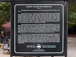 The Lakeside Theatre at Eisenhower Park in East Meadow, New York, was renamed Harry Chapin Lakeside Theatre during a memorial concert held one month after his death, as a tribute to his efforts to combat world hunger. Other Long Island landmarks named in honor of Chapin include a graduate-student apartment complex at Stony Brook University, a theater in Heckscher Park in Huntington, New York, and a playground at the intersection of Columbia Heights and Middagh Street in Brooklyn Heights.