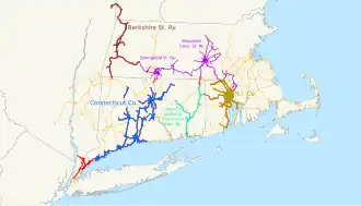 ![]() Connecticut Company (blue) and other New Haven electric railway subsidiaries | |