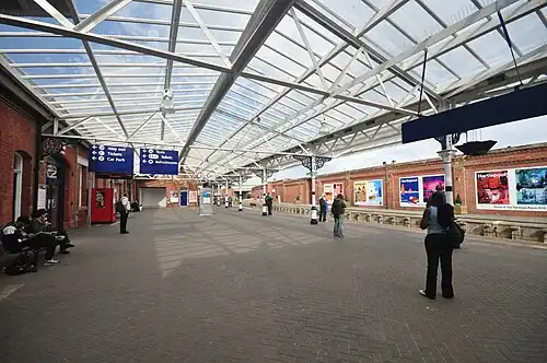 Between November 2009 and August 2010 (ahead of the town hosting the Tall Ships' Races), the station was extensively refurbished as part of a £4 million scheme to improve station facilities and integrate it into the new Hartlepool Interchange, works which were originally planned under the Tees Valley Metro project.[12][13] The line through the station was also re-signalled in spring 2010 as part of the Durham Coast modernisation scheme, with the consequent loss of three manual signal boxes in and around the station.[14] A new waiting room was also added to the station in 2011.