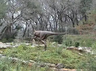 A life-size bronze sculpture of an Ornithomimus, the species of dinosaur believed to have left the tracks, was designed and sculpted by John Maisano and cast at the Deep in the Heart Art Foundry in Bastrop, Texas. The sculpture stands in the center of the gardens, on an island in the main pond.[4]