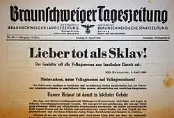 The U.S. Army entered Hanover on 10 April 1945. Shortly before the arrival of the Americans, and only 20 days before Adolf Hitler killed himself, Lauterbacher drove his family to safety in the Harz, but not before having announced over the radio the requisite exhortations for the public to hold out against the onslaught. He also issued a proclamation in the Braunschweig newspaper on 6 April threatening death to anyone who "cowardly and traitorously … hoists the white flag and surrenders without a fight".[15] Meanwhile, he had loaded up his car with cigarettes in order to flee south from the Harz posing as a cigarette sales agent. Leaving his family in the Harz on 11 April, he traveled to the military hospital at Bad Gastein, leaving there on 4 May and crossing into Austria where he was taken prisoner by the British Army on 26 May in Carinthia.[16]
