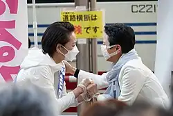 At 2 A.M on 8 October in 2021, shortly after the announcement of the next general election, the Tokyo Shimbun reported that Reiwa Shinsengumi leader Taro Yamamoto had decided to run in the 8th district in Tokyo, as he had run there previously. The report also stated that he was expected to become the "unified opposition candidate", causing confusion with Yoshida and the CDP.[14] CDP leader Yukio Edano held a press conference the following morning, asking Yamamoto to reconsider. He cited that "Our party's candidate has been rooted in the local community for many years and thinks that she can fight on equal terms in a single-seat district."[15] That evening, Yamamoto declared his candidacy for the district in front of Shinjuku Station. At this point, coordination between the CDP and JCP had progressed towards unifying behind Yoshida, but Yamamoto emphasized that coordination was progressing to unify behind him, saying, "We can't do this without collaborating."[15] On 9 October, Edano stated that he was "frankly confused", and the two sides were at odds.[16] After receiving backlash from local civic groups, Yamamoto withdrew from the district. He revealed that, in November 2019, the CDP had approached him to run in the district.[17] The JCP announced that Masatake had withdrawn, and the SDP Tokyo branch along with Reiwa Shinsengumi endorsed Yoshida.[18] Yamamoto instead ran in the Tokyo proportional block.[19]