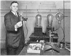 In a new type of "radio furnace" that melts metals in a vacuum, Dr. Rentschler succeeded in obtaining the rare metal uranium in a solid mass for the first time. The device that accomplished this remarkable result and thereby inaugurated a new science—"radiochemistry"—was designed to focus a large quantity of radio power in a small space, rather than transmit it to a distance.[3]