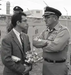 A Non-Violent Confrontation. June 1965, Oakland Army Base. Committee for Non-Violent Action offers gifts to soldiers being deployed to Vietnam. Photo by Harvey Richards.