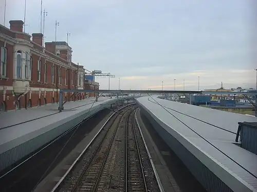 When opened the station consisted of two through-platforms serving the then double-track line to Harwich Town. This was supplemented by a bay platform at the eastern end of the main platform (the present-day Platform 1) which handled Harwich to Parkeston local services, which in the days of steam generally consisted of a J15 and later N2 or N7 tank engines and up to four carriages.[6] This service was timed to suit shift times both on the quay and in adjoining offices, the majority of workers being railway employees. The bay also had a loop allowing the running round of the locomotive. The main platform was and still is of sufficient length to accommodate a boat train of 10 or 11 coaches. The "up" (westbound) through-platform was shorter but this did not prevent it being used by the North Country boat train in the morning, which consisted of 11 or 12 carriages and would overhang the end of the platform considerably at the eastern end of the station.