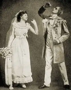 On 15 November 1873, Gilbert's play The Wedding March debuted at the Court Theatre, written under his pseudonym F. Latour Tomline. It was a free adaptation of Eugène Marin Labiche's Un chapeau de paille d'Italie ("The Italian Straw Hat"). The play was first to have been called Hunting a Hat, but the title was changed to capitalise on the popularity of the wedding march from Wagner's Lohengrin.[1] The name of the hero, Woodpecker Tapping, was taken from Thomas Moore's ballad, "The woodpecker tapping the hollow beech tree." The play ran for about 92 performances, until 3 March 1874, a good run for the time.[2] On the play's success, Stedman notes: