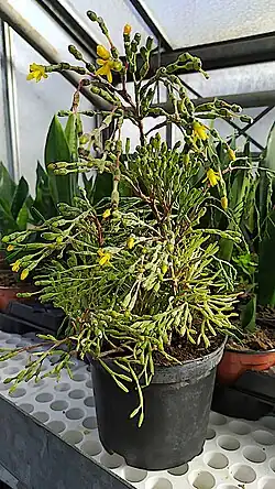 The species was first described by Adrian H. Haworth in 1819, as Rhipsalis salicornioides. Haworth had actually spelt the epithet "salicornoides"; subsequent authors have corrected the spelling, treating the original as an orthographic error.[6] The International Plant Names Index later deemed the specific epithet incorrectable to "salicornioides" as is it derived from a noun and a suffix rather than two Greek or Latin words.[7] The epithet means "similar to Salicornia". The species was placed under the genus Hatiora in 1915, after previously belonging to the “lost” (and ultimately, abandoned) genus of Hariota.[2] Molecular phylogenetic studies have confirmed its placement in the correct genus, and also in the tribe Rhipsalideae, showing a close relation to H. cylindrica (which has been considered synonymous with H. salicornioides, as a cultivar/form or variety). H. salicornioides is highly variable, as many succulent plants can be, and may possibly include other distinct species.[8][9]