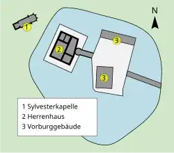 The Sylvester chapel, first mentioned in a document in 1397, stands northwest of the manor house and has predominantly Gothic elements. The small cemetery next to the chapel testifies to the fact that the place of worship was the church of the Protestant parish for centuries. Parts of its square west tower still show Romanesque forms. The tower has a round-arched portal with an oeil-de-boeuf above it. On the upper floor, the lower parts of formerly round-arched windows are still preserved. A round-arched passage leads into the nave, under which there is an inaccessible crypt. According to the report of a Weitmar priest, members of the owner families of Haus Weitmar and Haus Bärendorf are said to have been buried there in former times.[11] The southern wall of the nave is still preserved up to the height of the window sills, but the northern wall is only present in the base area. On the east side, a pointed arch opening leads into the late Gothic choir, which is three steps higher than the nave. The square section has a 3/8 closure and openings for lancet windows. The corbels for the former choir vault are still preserved. On the north side, there is a late Gothic Church tabernacle with crowning wimperg. Opposite this is a triangular lavabo.