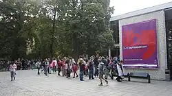 In 1992, the Senate of Berlin withdrew funding from the Theater der Freien Volksbühne, and in 1999 it was sold to an investor. In 2000, the theatre was rented by the federal government and made available to the Berliner Festspiele. In April 2001, it was reopened as the Haus der Berliner Festspiele and played host to events at various festivals throughout the year.[4] The house, with a capacity of well over 1,000 seats (Main Stage: 999, Side Stage: 280, Upper Foyer: 200, Rehearsal Stage: 100, Box Office Hall: 200), has remained almost unchanged to this day and is a listed building. Since its construction, the Berliner Festspiele has regularly used it for the Berliner Theatertreffen and international guest performances. As a festival and event venue, it presents international artists from all fields throughout the year, for example international authors every September as part of the Berlin International Literature Festival.[5]