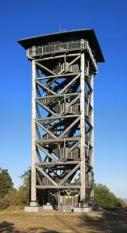 The Hausberg is a mountain with an elevation of 486 m next to Butzbach in Hesse, Germany. It is part of the Taunus mountain range and located at its easternmost part bordering the fertile landscape of the Wetterau, which is of a much lower altitude. Therefore, the mountain is well situated for look-out and in 1873 a first look-out tower was erected on its top. In 1875 a storm damaged the tower severely, but it was repaired in the following year and remained in use until 1941 when it was demolished due to being in disrepair. More than 60 years later in June 2007 the construction of a new tower started and was completed in May 2008. The new tower has a total height of 23 m and a roofed observation deck at 19 m.