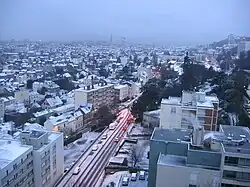 Precipitation is distributed throughout the year, with a maximum in autumn and winter. The months of June and July are marked by some thunderstorms on average 2 days per month.[26] One of the characteristics of the region is the high variability of the temperature, even during the day.[27] The prevailing winds are from the southwest sector for strong winds and north-north-east for breezes,[28] snowstorms occur in winter, especially in January and February.[26]