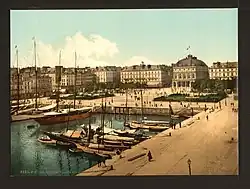 The name of the town was attested in 1489, even before it was founded by François I in the form le Hable de Grace then Ville de Grace in 1516, two years before its official founding.[11] The learned and transient name of Franciscopolis in tribute to the same king, is encountered in some documents then that of Havre Marat, referring to Jean-Paul Marat during the French Revolution but was not imposed. However it explains why the complementary determinant -de-Grace was not restored.[11] This qualifier undoubtedly referred to the Chapel of Notre Dame located at the site of the cathedral of the same name. The chapel faced the Chapel Notre Dame de Grace of Honfleur across the estuary.[11] The common noun havre meaning "port" was out of use at the end of the 18th or beginning of the 19th centuries but is still preserved in the phrase havre de paix meaning "safe haven". It is generally considered a loan from Middle Dutch from the 12th century.[12] A Germanic origin can explain the "aspiration" of the initial h. Havre de Grace, Maryland, in the United States retains the "de Grace" from colonial times.