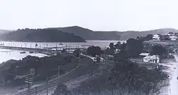 Whilst the main line terminated at Hawkesbury River, an arrangement of trackwork, sidings and platforms was provided on the causeway formed by reclaimed land on the eastern side of Long Island where the new Long Island tunnel had been constructed. The station was known as River Wharf and the tracks terminated at a wharf at the edge of the waterway. The purpose of the arrangement was to allow transhipment between the railways and river ferries, thus allowing passengers to cross the waterway, to another wharf on the northern side of the river, while the Hawkesbury River Bridge was under construction.[4] Hawkesbury River became a popular destination for day trippers and fishermen, outstripping the capacity of the original timber platform building. This was replaced in 1903 with the current brick building, which is of the type that had recently been adopted as the standard construction for island platforms.[5]