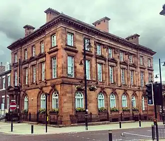 The building was constructed in Penrith red sandstone and ashlar with a Lakeland slate roof. The exterior design is neoclassical and features Ionic porches, Tuscan window bays, architraves and dentilled cornices .