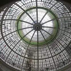 The interior features a baroque , open stairwell with a glazed dome and high relief swags . The neoclassical design is repeated in the former board room, which has stucco wall panels and Ionic columns and pilasters .