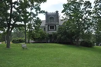Kingsland Bay is a north-facing inlet on the east side of Lake Champlain, at a point where the lake briefly bends eastward. The bay is flanked by Hurlburt Point to the west and Macdonough Point to the east, both of which are contained in Kingsland Bay State Park, a day-use facility operated by the state. The Hawley House is located on the west side of Macdonough Point, where most of the park facilities are located. It is a 2+1⁄2-story gable-roofed structure, built out of local stone. Its walls are fairly uniformly 2 feet (0.61 m) thick. It is five bays wide and three deep, with a central hall plan. A three-story tower stands at the northeast corner, added about 1900.[2]