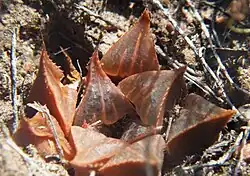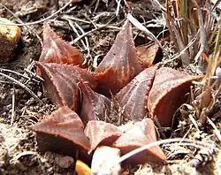 Haworthia mirabilis var. badia, the reddish-brown attenuate variety, sometimes considered the separate species Haworthia badia. -