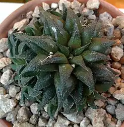 Haworthia parksiana is a species of succulent plant native to the Western Cape of South Africa.[1] Regarded as the smallest and one of the rarest types of Haworthia in the wild,[2] it is thought to be most closely related to Haworthia floribunda.[3] It grows in rosettes up to about 4 centimetres (1.6 in) in diameter,[4] and is often hidden in the ground.[2]