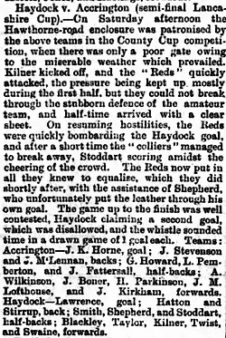 As an amateur side of "second class school" footballers[5] in the professional stronghold of Lancashire, the club was never likely to be successful, but it unexpectedly reached the semi-final of the Lancashire Cup in 1888–89, one of its victims en route being Darwen; Darwen turned up at Haydock late and with only 9 players, and the Colliers won 3–2.[6] In the last four stage, the club met the professional side Accrington at Bootle's Hawthorne Road ground. The tie was considered to be a foregone conclusion for the Owd Reds, and an indication of the difference in size of the two sides is that only around 50 people went along as supporters of the Colliers. However, the match ended 1–1, and Haydock even thought it had won the match, with an ostensibly winning goal disallowed.[7] Accrington won the replay 6–1.[8]