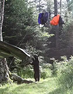 Harmful encounters between animals and people can occur when animals try to get human food. Above a Black Bear is unsuccessful getting into backpacks because they are hung out of reach. Proper food storage protects both people and animals.