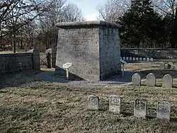 During the summer of 1863, while the Union Army of the Cumberland outmaneuvered Bragg's Confederates in the Tullahoma campaign, members of Hazen's Brigade were detailed back to Stones River to build a monument both to commemorate the heroism of the brigade and to memorialize their lost comrades.[5] A construction detail under Lt. Edward Crebbin placed the monument on private property in the middle of the brigade cemetery in Round Forest.[6] A Union army captain described the monument as a "quadrangular pyramidal shaft, ten feet square at the base and eleven feet in height....A dry-stacked stone wall, four feet high and two feet thick, enclosed both monument and cemetery. Three low steps breached the wall's south side to allow access."[7] In 1864 two experienced stone cutters from the regiment carved the inscriptions, including names of the regimental officers killed at Stones River and the earlier Battle of Shiloh. On the south face the stone cutters inscribed the words, HAZEN'S BRIGADE/ TO THE MEMORY OF ITS SOLDIERS WHO FELL AT STONES RIVER, DEC. 31ST 1862/ THEIR FACES TOWARDS HEAVEN, THEIR FEET TO THE FOE.[8]
