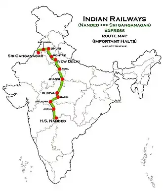 The 12485 / 86 Hazur Sahib Nanded–Shri Ganganagar Junction Express runs from Hazur Sahib Nanded via Purna Junction, Akola Junction, Itarsi Junction, Bhopal Junction, Bina Junction, Agra Cantonment, New Delhi, Bathinda Junction to Shri Ganganagar Junction.
