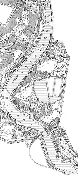 There is a dangerous waterfall less than 300 meters from the finish line across from Boathouse Row.[14] The 13-foot Fairmount Water Works Dam stretches 400 meters across the Schuylkill.[14]