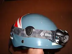 Headlamps are usually powered by three or four AA or AAA batteries, or rechargeable batteries. Systems with heavier batteries (4xAA or more) are usually designed so that the light emitter is positioned near the front of the head, with the battery compartment at the rear of the head.[1] The headlamp is strapped to the head or helmet with an elasticized strap.[2] Some headlamps have a separate battery pack connected by a cable, to be carried on a belt or in a pocket.[2]