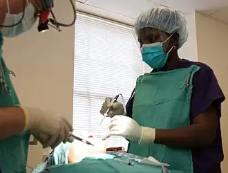 In 2015, life expectancy at birth was 66.18 years with males at 63.76 years and females at 68.66 years.[11] Infant mortality is at 37.37 per 1000 live births.[12] The total fertility rate is 4.06 children per woman among the 15 million Ghanaian nationals. In 2010, there were about 15 physicians and 93 nurses per 100,000 persons.[13]