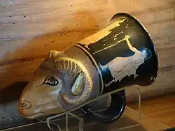 The ancient Egyptian, Greek and Roman antiquities are the oldest works in Hearst's collection. The oldest of all are the stone figures of the Egyptian goddess Sekhmet which stand on the South Esplanade below Casa Grande and date from the Eighteenth and Nineteenth Dynasties, approximately 1550 to 1189 BC.[229] Morgan designed the pool setting for the pieces, with tiling inspired by ancient Egyptian motifs.[230] In the courtyard of Casa del Monte is one of a total of nine Roman sarcophagi collected by Hearst, dated to 230 AD and previously held at the Palazzo Barberini, which was acquired at the Charles T. Yerkes sale in 1910.[208] The most important element of the antiquities collection is the holding of Greek vases, on display in the second-floor library.[231] Although some 65 vases were purchased by the Metropolitan Museum of Art in New York after Hearst's death,[232] those which remain at the castle still form one of the world's largest groups.[y][233] Hearst began collecting vases in 1901, and his collection was moved from his New York homes to the castle in 1935. At its peak, the collection numbered over 400 pieces. The vases were placed on the tops of the bookshelves in the library, each carefully wired in place to guard against vibrations from earthquakes.[234] At the time of Hearst's collecting, many of the vases were believed to be of Etruscan manufacture, but later scholars ascribe all of them to Greece.[234]