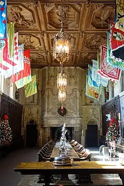 The refectory was the only dining room in the castle, and was built between 1926 and 1927.[172] The choir stalls which line the walls are from the La Seu d'Urgell Cathedral in Catalonia, Spain,[177] and the silk flags mounted on the walls are Palio banners from Siena, Italy.[t][179] Hearst originally intended a "vaulted Moorish ceiling" for the room but, finding nothing suitable, he and Morgan settled on the Italian Renaissance example, dating from around 1600, which Hearst purchased from a dealer in Rome in 1924.[180] Victoria Kastner considered that the flat roof, with life-size carvings of saints, "strikes a discordant note of horizontality among the vertical lines of the room".[181] The style of the whole is Gothic, in contrast to the Renaissance approach adopted in the preceding assembly room.[159] The refectory is said to have been Morgan's favorite interior within the castle.[182] The design of both the refectory and the assembly room was greatly influenced by the monumental architectural elements, especially the fireplaces and the choir stalls used as wainscoting, and works of art, particularly the tapestries, which Hearst determined would be incorporated into the rooms.[183] The central table provided seating for 22 in its usual arrangement of two tables, which could be extended to three or four, on the occasion of larger gatherings.[184] The tables were sourced from an Italian monastery[185] and were the setting for some of the best pieces from Hearst's collection of silverware. One of the finest is a wine cooler dating from the early 18th century and weighing 14.2 kg by the Anglo-French silversmith David Willaume.[186]