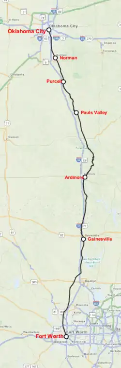 | Termini | Oklahoma City, Oklahoma Fort Worth, Texas | ||||||||||||||||||||||||||||||||||||||||||||||||||||||||||||||||||||||||||||||||||||||||||||||||||||||||||||||||||||||||||||||||||||||||||||||||||||||||||||||||||||||||||||||||||||||||||||||||||||||||||||