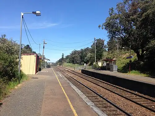 In 1950, flashing light signals were provided at Escrites Road level crossing, located nearby in the down direction from the station.[1] By 1958, the up platform (Platform 1) had been reduced in length, from 376 to 150 feet (115 to 46 m).[3]