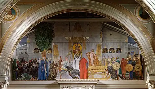 A golden chain goes round the temple. It hangs over the gable of the building and sends its glitter far off to those who approach, because the shrine stands on level ground with mountains all about it like a theater.[21]