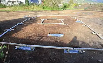 The remains of the building consist of holes and trenches for the placement of the pillars and walls that once stood there. Various floor levels were discernible, and it was possible to determine that the hof was initially erected in the 3rd century C.E. on the site of an unusually large longhouse, and then rebuilt six times without appreciable changes, the last version of the building dating to the early Viking Age.[41] The building material was in all cases wood, which was also sunk into the ground.