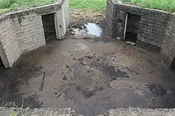 Each emplacement had an entrance corridor on one side, leading into the gun pit of the emplacement; a central group of bolts for securing the gun's hexagonal metal base plate to the concrete; and surrounding lockers in the walls of the gun pit, for "ready" ammunition, fuses etc.[42] Photographs of the Lytton gun station, taken in November 1943, show doors on each of the ammunition lockers in the gun emplacements; and pairs of cinder block walls within the entrance corridor to each emplacement - protecting the gunners from any bomb splinters from that direction.[43][1]