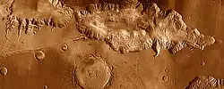 Hebes Chasma is a completely closed depression in the surface of Mars, with no outflows to the nearby Echus Chasma to the west, Perrotin Crater to the southwest, or Valles Marineris to the south. Its maximum extents are approximately 320 km east to west, 130 km north to south, and 5 to 6 km in depth. At the center of the depression is Hebes Mensa, a large mesa rising some 5 km off the valley floor, nearly as high as the surrounding terrain. This central plateau makes Hebes Chasma a unique valley in Martian geography.