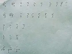 Hebrew Braille (Hebrew: ברייל עברי) is the braille alphabet for Hebrew. The International Hebrew Braille Code is widely used. It was devised in the 1930s and completed in 1944. It is based on international norms, with additional letters devised to accommodate differences between English Braille and the Hebrew alphabet.[1] Unlike Hebrew, but in keeping with other braille alphabets, Hebrew Braille is read from left to right instead of right to left,[2] and unlike English Braille, it is an abjad, with all letters representing consonants.