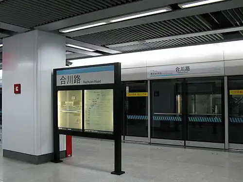 Hechuan Road (Chinese: 合川路; pinyin: Héchuān Lù) is an underground station on Shanghai Metro Line 9. It began operation with the rest of Line 9 on December 29, 2007.[1] It is located at the corner of Yishan Road and Hechuan Road.