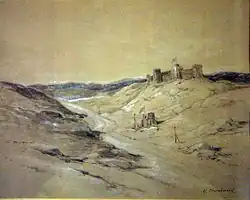 After this business failure Hedley was apprenticed to the well-known scene-painter Walter Brookes Spong of Sadler's Wells Theatre, and in the late 1880s became an important part of London's West End circle of artists, working at the Globe Theatre and Drury Lane, and with notable figures such as Tennyson, Millais, Lord Leighton, and Lily Langtry. In 1889 he worked as a scene painter in Melbourne, Australia and exhibited at the Victorian Artists' Society there.[11] From 1890 to 1891 he was working elsewhere in Australia.[12]