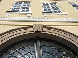 The main wing towards the street is built in the Neoclassical style. It is 16 bays long and consists of three storeys and a six-bay attica topped by a baluster-balustrade. A sculpted cow's claw on the keystone above the gateway dates from the first owner of the house, Hans Peder Kofoed, and is a reference to his family name, Kofoed, which translates as "cow's foot" and is a name commonly associated with his native island of Bornholm.[3]