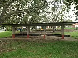 The Hefferan Park air raid shelter is a rectangular concrete structure comprising a heavy floor slab and a flat roof supported by concrete piers. It stands adjacent to a playground under the canopies of mature fig trees in the northern end of Hefferan Park, which is located at a major road intersection, and is near the Dutton Park railway station. The roof of the shelter is painted light green. The bottom sections of the piers are painted red, while the upper sections of the piers are painted white. The floor of the shelter is paved with red and white pavers in a diagonal pattern.[1]