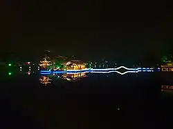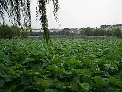 Hehuachi is part of Yangzhou's intricate network of lakes and canals. The Erdaohe (二道河) Canal, running along the western edge of Yangzhou's old city, comes to the Hehua Pond from the north, connecting it with the Thin West Lake at the city's northwest. The short (300-meter long) Erdaogou (二道沟) Canal runs east from the Hehua Pond, linking it with the nearby old channel of the Grand Canal of China, which forms the old city's southern and eastern borders.[2] It is possible to sail a small water craft from the Thin West Lake, via the Erdaohe, the Hehua Pond, and the Erdaogou into the Old Grand Canal.[3]