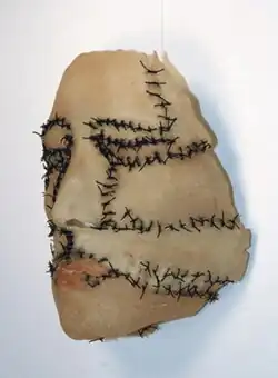 Since 2004, Hatry also created a significant body of performance works, many documented in videos, including "Skin Room",[34][35] which was performed in the Heidelberger Kunstverein, Germany; "Politics",[36] which was performed on 9/11, 2007 in Central Park, New York, with a huge American flag made out of pigskin and spattered with blood; and her best-known performance-work, "Expectations", which has been presented at several venues including the Hudson Valley Center for Contemporary Art, Peekskill, NY; Brown University, Providence, RI; Studio Soto, Boston, MA; Kunstverein Nord, Berlin, Germany; and the 10th Barcelona Art Contemporari Festival, Barcelona, and at Catinca Tabacura Gallery in NY in 2017.