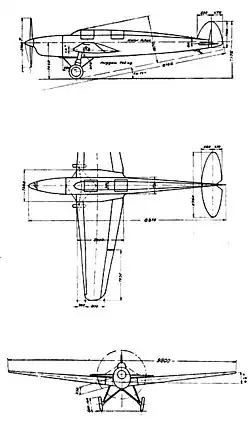 The aircraft was furnished with a single-spar trapezoidal-shaped slotted wing; this was claimed to be the first such application of a slotted wing with a single spar structure.[2] It was composed entirely of wood and attached to the central portion using bolts. The wing could be easily folded; to permit this, there was no conventional sheet covering at the connection point of the wing, leaving a free slot that was roughly 1mm across. The automated slots were coupled to the trailing flaps; their use permitted the aircraft to fly at a relatively steep climbing angle as well as low landing speed could be reasonably obtained.[1]
