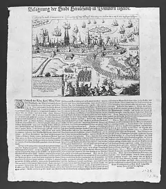 Holk was born in Kronborg castle, Denmark. Serving Christian IV, he was commander of the Danish-Scottish force in the Battle of Stralsund in 1628, defending the besieged town of Stralsund against Wallenstein's imperial army. When Christian was forced into a peace with Wallenstein in 1629, Holk entered the latter's service. In 1632, he was given a cavalry command. His unit, referred to as "Holk's Horse", was known for their fierce attitude not only in battle, but also in pillage and rape - "notorious even in an age of atrocities". He took part in the devastation and looting of the Electorate of Saxony, and faced Gustavus Adolphus of Sweden's cavalry in the Battle of Lützen. The battle marked the end of his active career, though he remained in office as a senior commander.[3] The following year, he died of plague in Kronborg castle, Denmark while negotiating a truce after a two-week battle near Saxony.