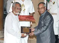 ![]() Pranab Mukherjee presenting the Sangeet Natak Akademi Fellowship to Shri Heisnam Kanhailal, at the investiture ceremony of the Sangeet Natak Akademi Fellowships and Sangeet Natak Akademi Awards-2011, at Rashtrapati Bhavan | |