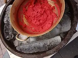 Today, helado de paila continues to be made at various Colombian and Ecuadorian tourist sites, markets, and festivals, in flavors like blackberry, soursop, naranjilla, coconut, strawberry, tree tomato, mango, and passion fruit.[1][7] The fruit is blended with sugar before being stirred with a wood spatula in the basin over ice and a bed of straw, producing a texture similar to that of sorbet.[1][6][7]